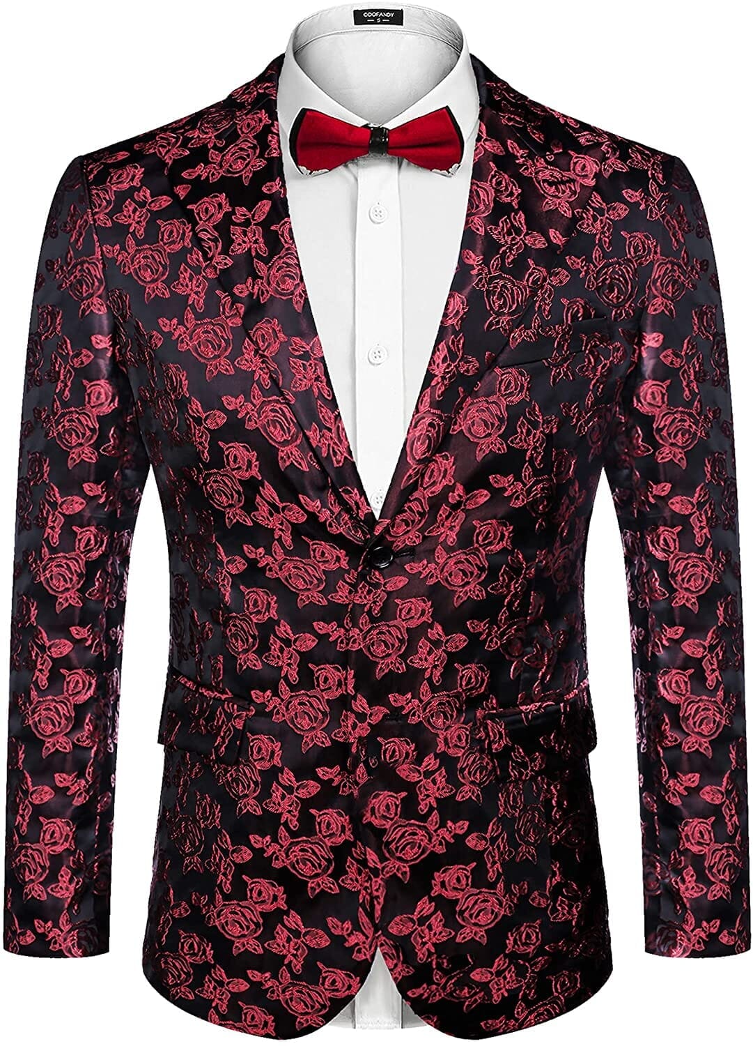 - Stylish wedding blazer design featuring with rose embroidered pattern, peaked lapel, 2-button, one front real pocket, 2 side real pockets and 2 inside pockets, comes black,blue,red,gold,wine red colors to choose from S-XXL.