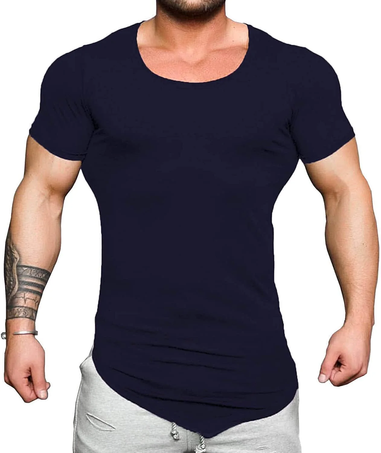 - Solid color classic design, round neck irregular hem, make you look more muscular and stronger.